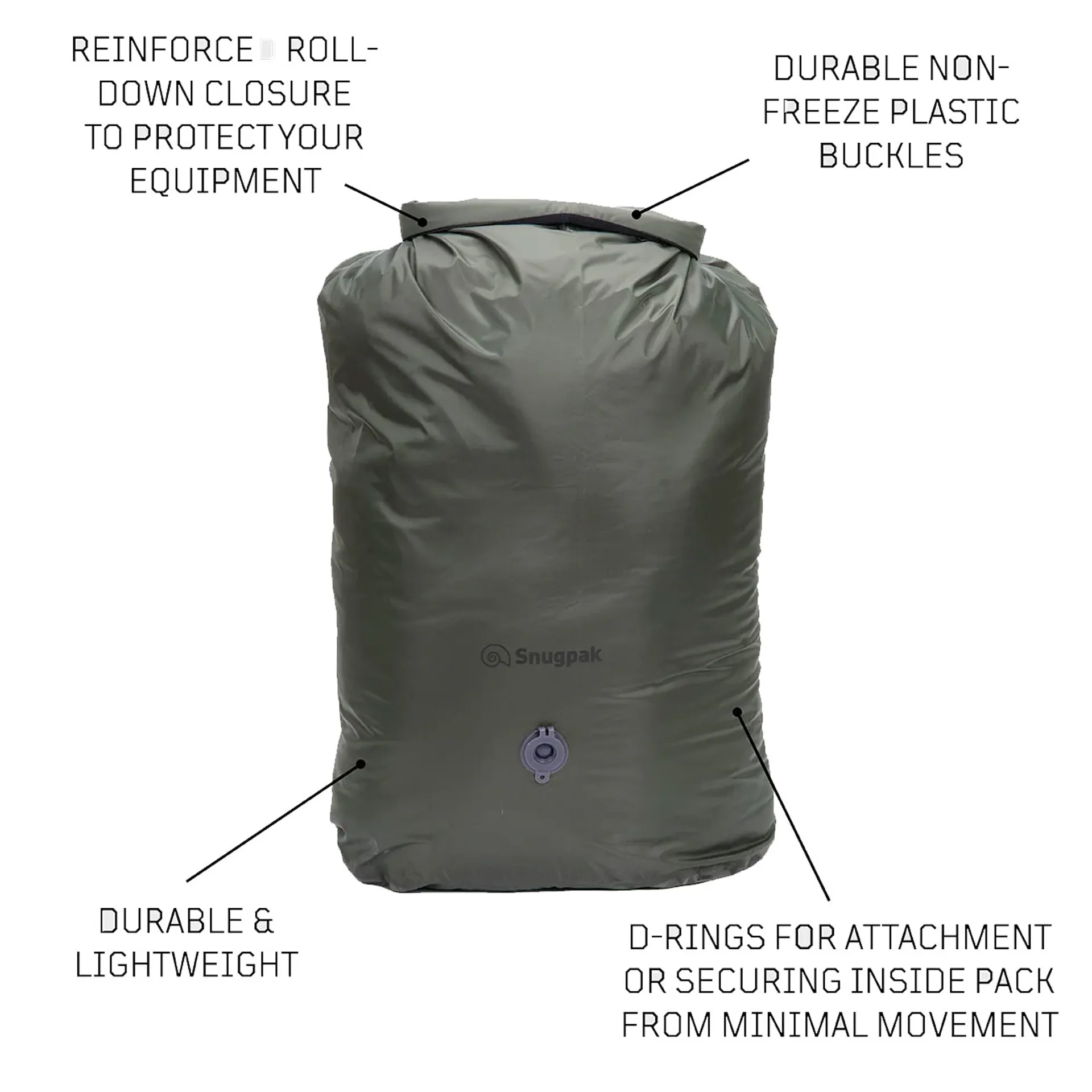 Tough ventures and inclement weather place extra demands on your kit, and there is nothing worse than finding equipment wet, or at worse, damaged, when out on the hills. This heavy-duty waterproof storage bag with valve, roll and clip seal, will ensure your contents stay dry, keeping your essential equipment safe from the elements in a 100% waterproof pack.A typical problem with traditional dry bags is the difficulty of squeezing out all the air while trying to pack up your kit. The Dri-sak with valve WGTE resolves this issue by allowing you to open the valve after you have packed your equipment so you can easily squash out any excess air before resealing. This means you get the maximum amount of compression to ensure you have the smallest pack size possible.Synthetic Insulation and other equipment need to be protected when not worn, and in inclement weather, water can penetrate your pack from all angles inside and out. The Snugpak® Dri-Sak™WGTE creates an enclosed 100% waterproof environment for essential equipment and is made from a lightweight nylon fabric; additional D-rings allow the Dri-Sak™WGTE to be clipped together, or secured vertically/horizontally in your pack to minimise movement when moving over difficult and dangerous terrain. The 100% waterproof material also keeps out sand, dust and snow, for overseas and colder ventures and expeditions, and they are a great way of separating wet/dry and clean/dirty items of clothing and equipment. In an emergency, the design can also be used to carry emergency water supplies as an impromptu bladder. If inflated without contents, they also make excellent emergency pillows!