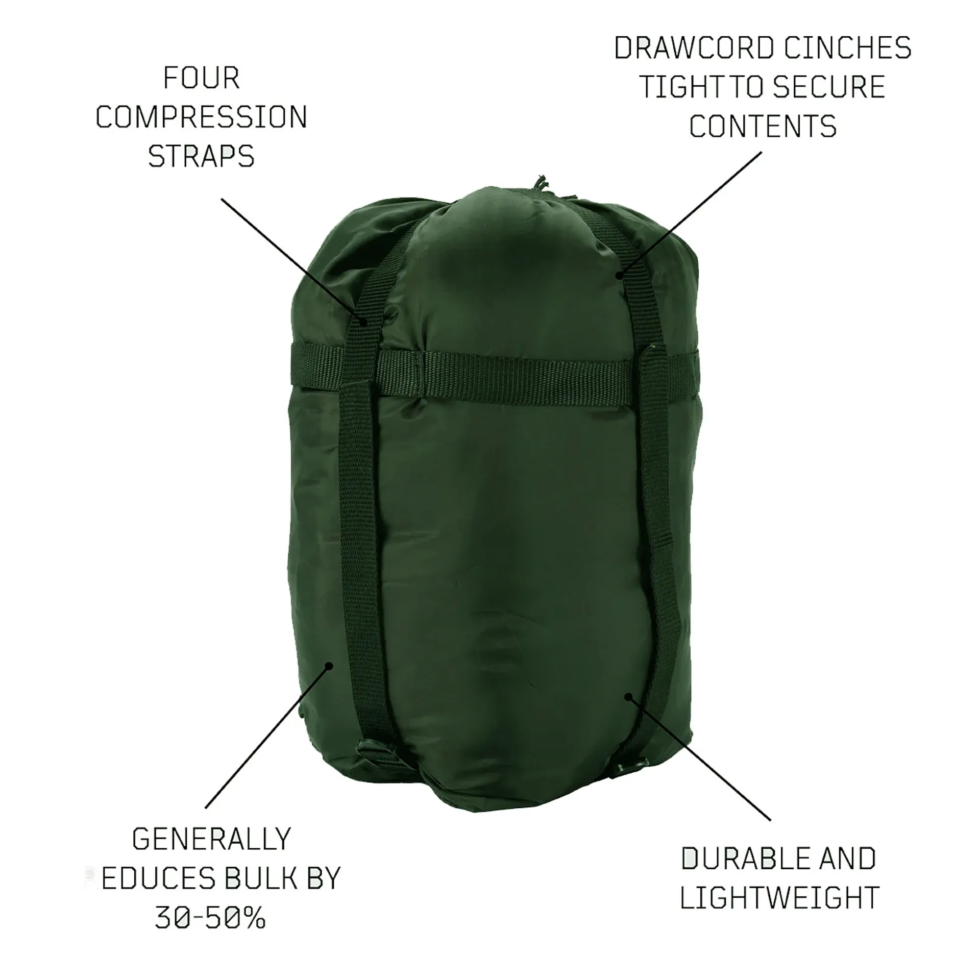 Saving space is a sensible and often necessary approach to camping and trekking, but it can be made so much easier with a Compression Storage Sack WGTE. Traditionally used for sleeping bags, these sacks can be used on any compressible item such as fleeces, pullovers and other clothing, generally reducing the bulk by 30-50%. Available in four different sizes, they can be a great advantage when you’re on the move, and they’re also useful at home.-Durable and lightweight, made from tough nylon-Four compression straps allow the sack to be used to maximum capacity-Generally reduces bulk by 30-50%-Drawcord cinches tight to secure contents